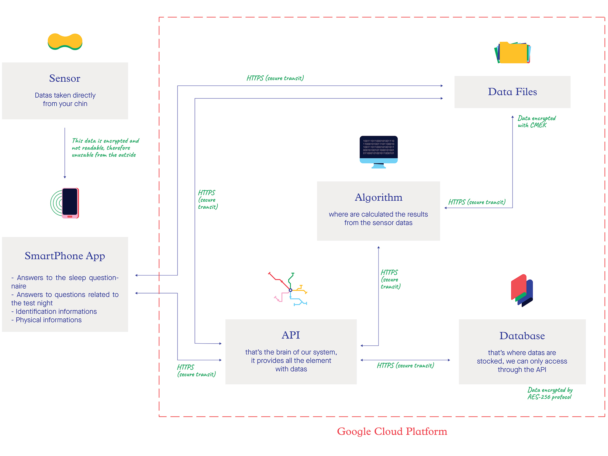 Between the website, the Sunrise app and the sensor that captures your mandibular movements at night, data is collected from multiple places and reaches separate servers. And because a picture is worth 1000 words, we preferred to draw you a diagram to explain the flow of data through the Sunrise system.